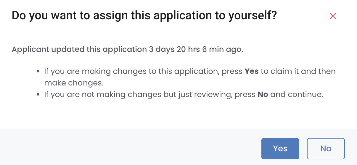 While the back office automation is created for a hands-off LOS experience for your financial institution, you can self assign or assign applications to other team members to update information on the application. When clicking the pencil icon to open an application, you will receive the below prompt: